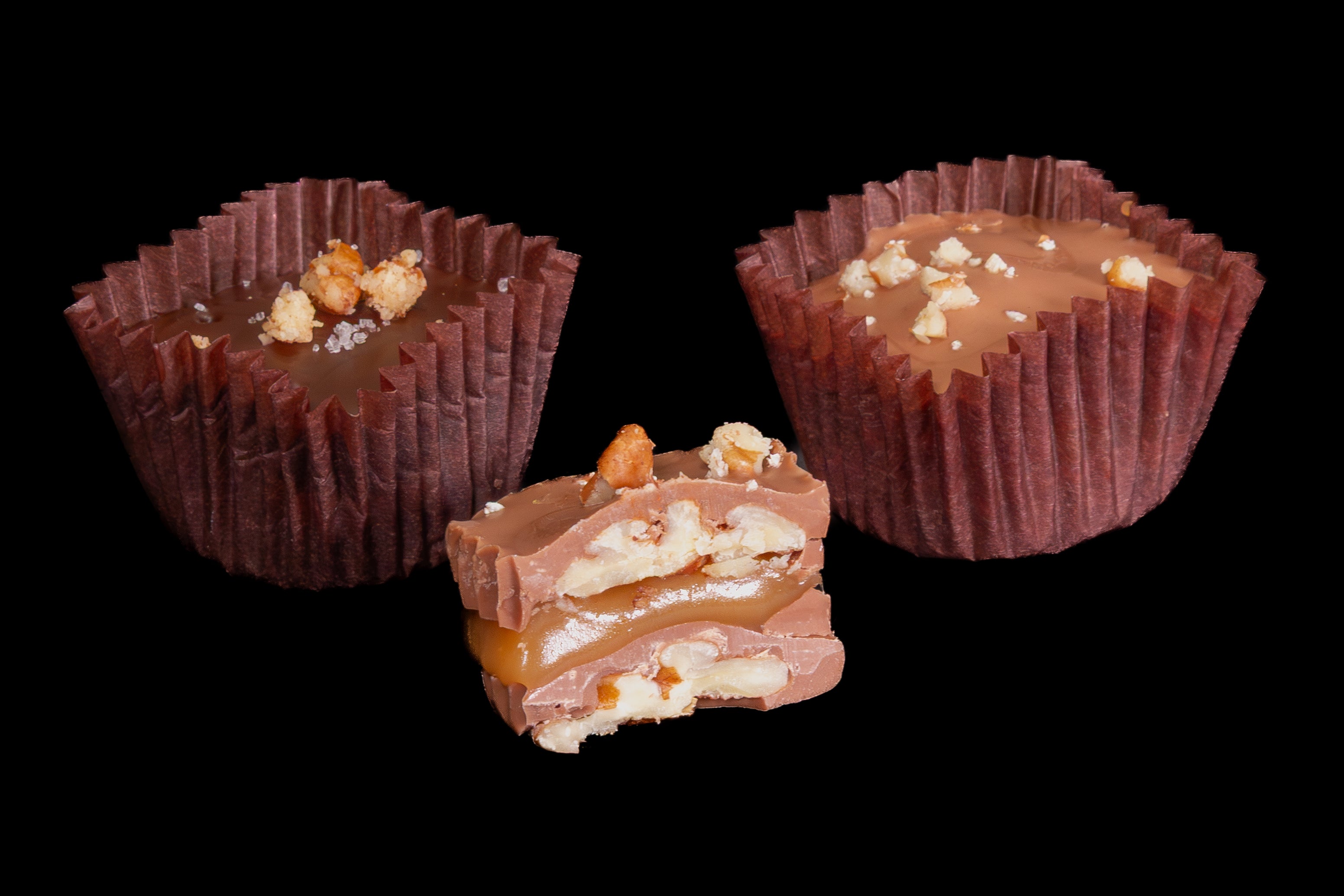 Ingredients: Callebaut Chocolate, Caramel and Spiced Pecans. Enrobed in White, Milk or Dark Callebaut Chocolate.