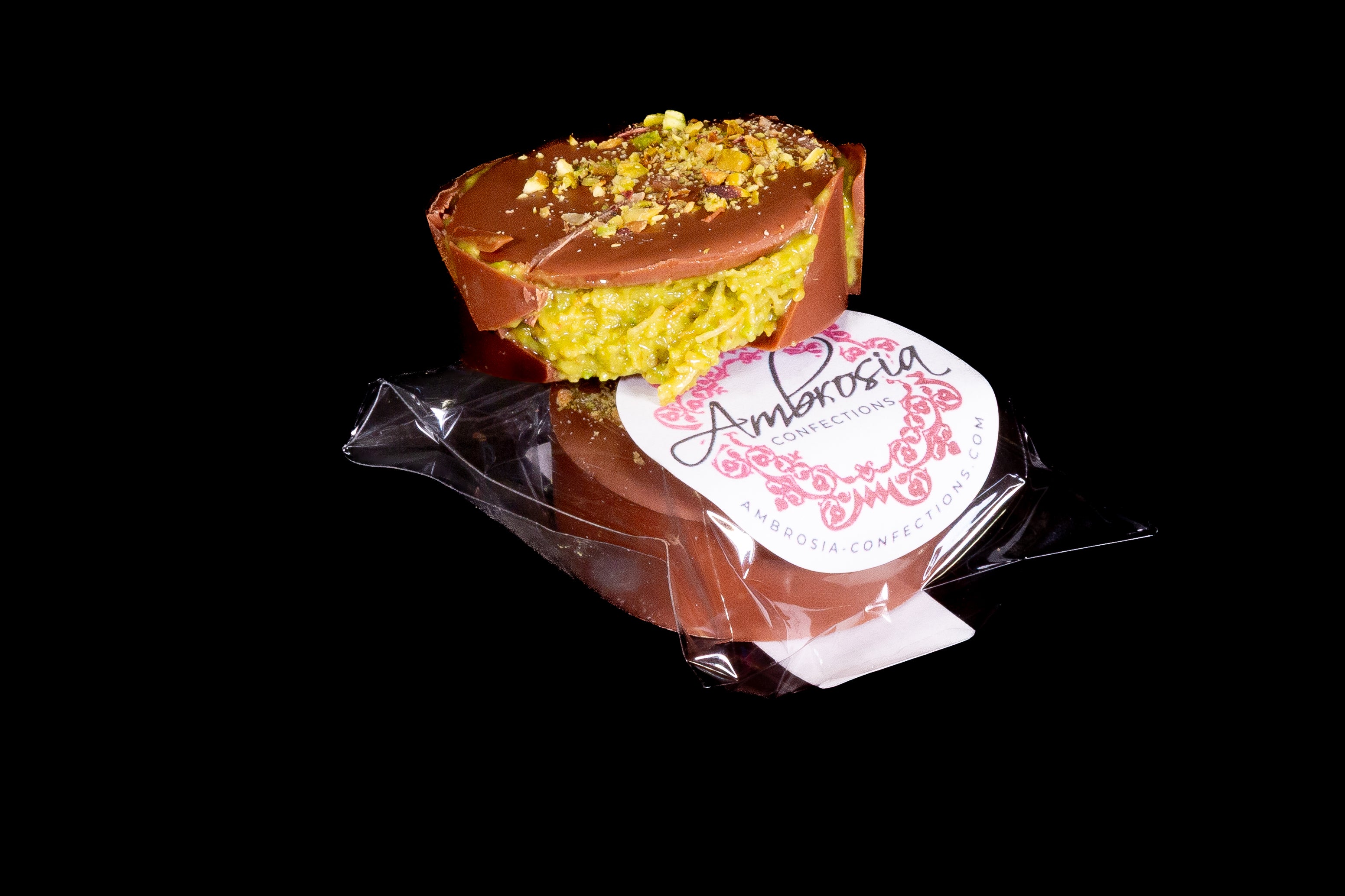 Ingredients: Callebaut chocolate, Artisan Pistachio Cream. Enrobed in White, Milk or Dark Callebaut Chocolate.